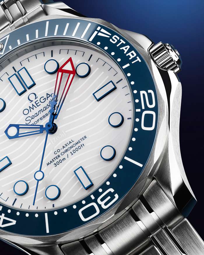 Realizzato in acciaio inossidabile, il Seamaster Diver 300M da 42 mm presenta una lunetta unidirezionale in ceramica blu con una scala a tema regata composta da due sezioni pre-start da 5 minuti e una sezione START con bandiera a tema regata.