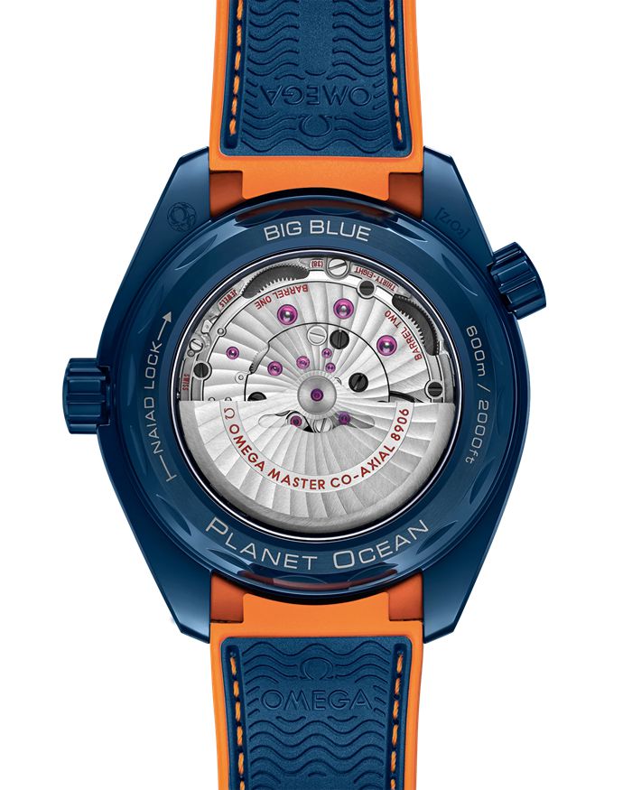 Il “Big Blue” unisce un orologio subacqueo alla funzione GMT con uno stile audace e un design innovativo. La cassa da 45,5 mm è realizzata in ceramica blu e monta unalunettain ceramica blu con scala graduata in Liquidmetal™. Un mix di caucciù arancione e ceramica riveste i primi 15 minuti. Il caucciù arancione si può apprezzare anche nel logo OMEGA sulla corona e sulla valvola dell’elio.