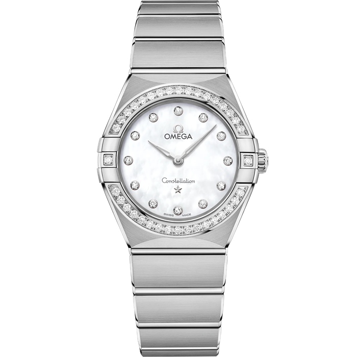 Questo modello da 28 mm in acciaio inossidabile presenta una lunetta tempestata di diamanti, un quadrante in madreperla bianca con indici delle ore in diamanti e un vetro zaffiro resistente ai graffi. Le lancette, il logo OMEGA, la stella Constellation e i supporti dei diamanti sono in oro bianco 18K.
