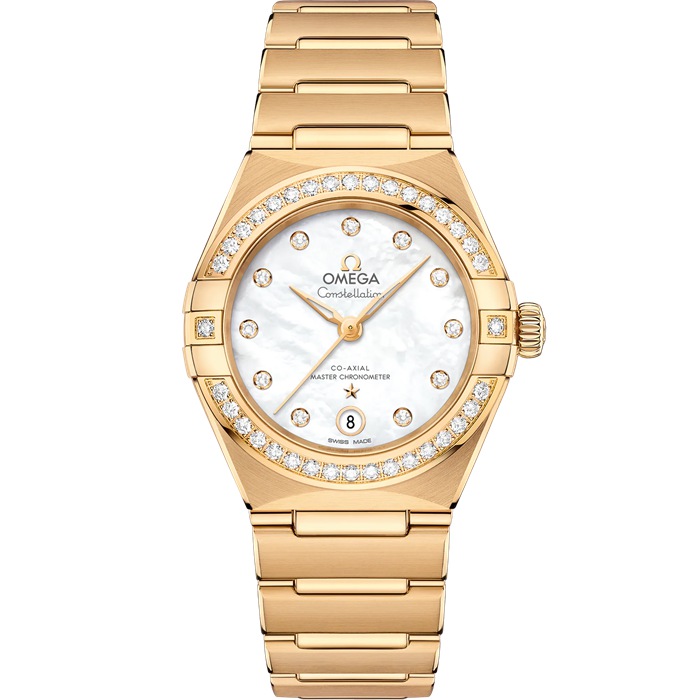Questo modello da 29 mm in oro giallo 18K presenta una lunetta tempestata di diamanti, un quadrante in madreperla iridescente con indici delle ore in diamanti e un datario a finestrella a ore 6. Sono in oro giallo 18K anche il bracciale, le lancette, il logo OMEGA, la stella Constellation e i supporti dei diamanti.