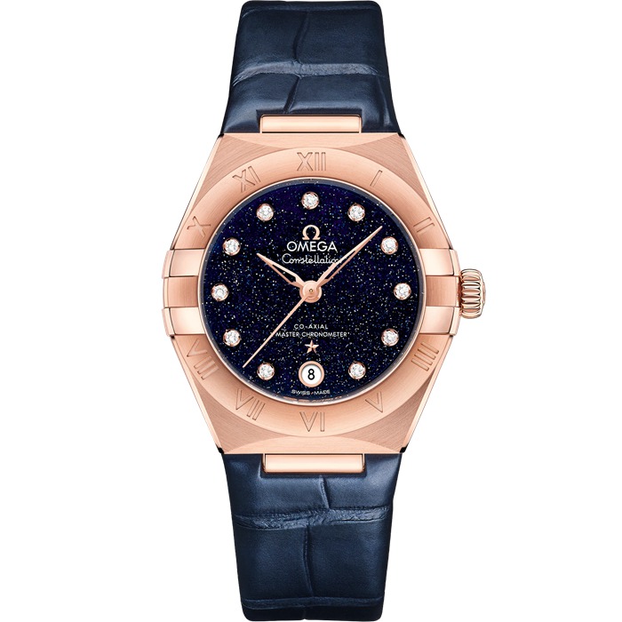 Questo modello da 29 mm in oro Sedna™ 18K presenta una lunetta con numeri romani incisi, un quadrante in vetro avventurina blu con indici delle ore in diamanti e un datario a finestrella a ore 6. Le lancette, il logo OMEGA, la stella Constellation e i supporti dei diamanti sono anch’essi in oro Sedna™ 18K.