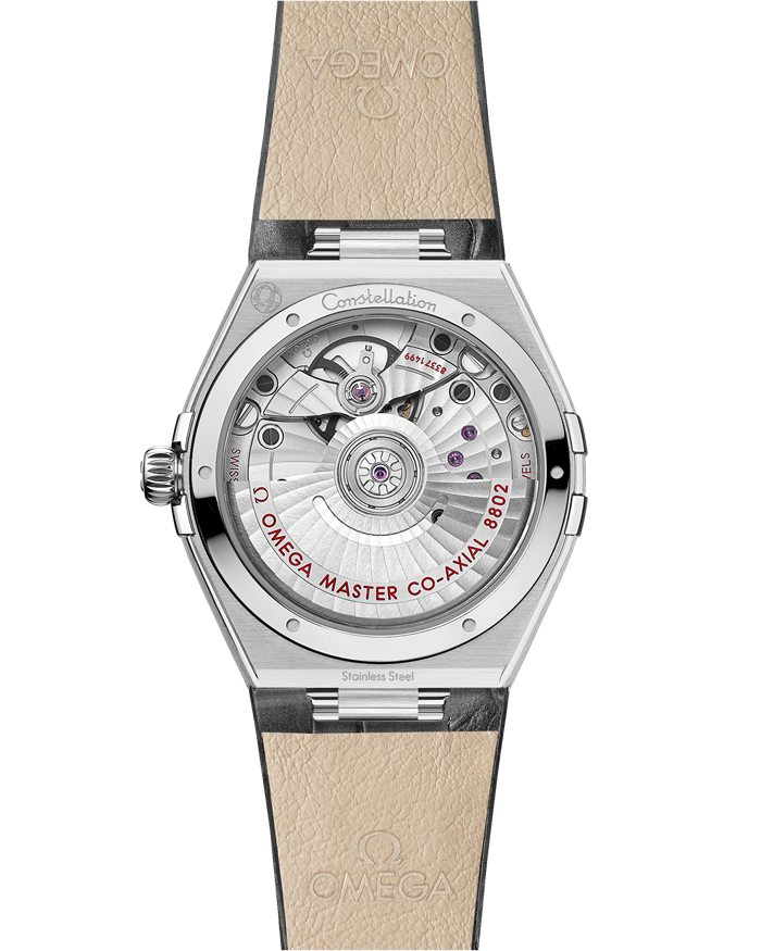 Questo modello da 34 mm in acciaio inossidabile presenta una lunetta con numeri romani incisi, un quadrante bianco argentato cristallo e un datario a finestrella rotondo a ore 6. La stella Constellation, il logo OMEGA, le lancette e gli indici delle ore lucidi sono realizzati in oro bianco 18K, mentre il quadrante dei piccoli secondi e la minuteria centrale sono cerchiati da anelli.