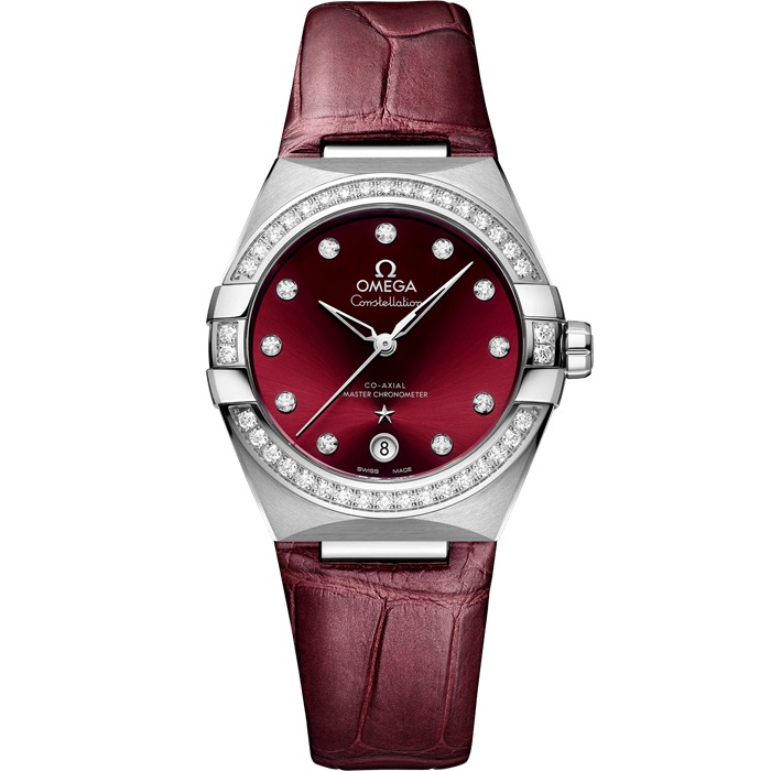Questo modello da 36 mm in acciaio inossidabile presenta una lunetta lucida impreziosita da 38 diamanti, un quadrante con trattamento in PVD bordeaux e finitura spazzolata a raggi di sole e un datario a finestrella a ore 6. Le lancette, il logo OMEGA, la stella Constellation e gli indici sono tutti in oro bianco 18K.