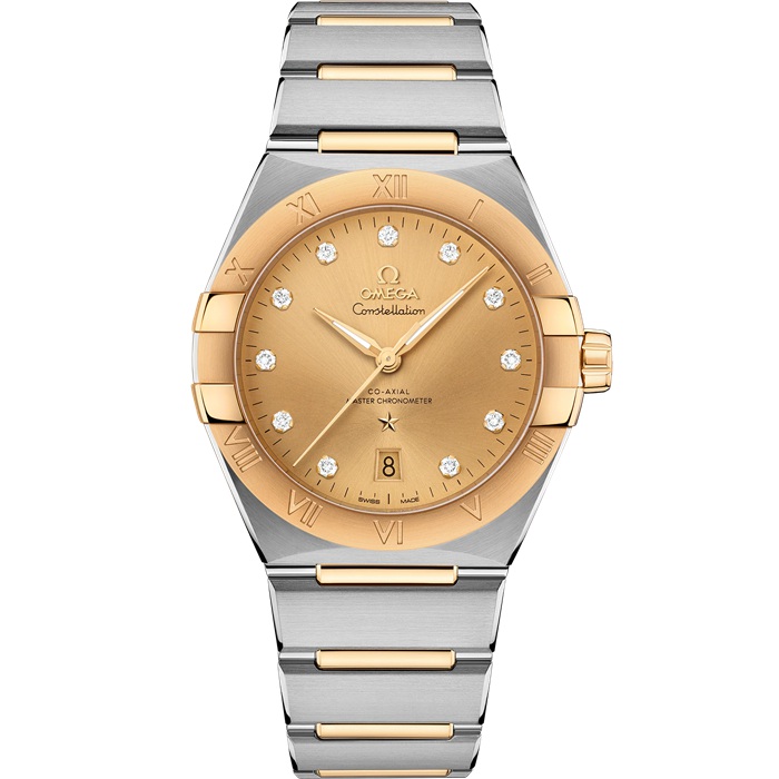 Questo modello da 39 mm in acciaio inossidabile e oro giallo 18K presenta una lunetta con numeri romani incisi, un quadrante champagne con finitura spazzolata a raggi di sole e indici in diamanti, e un datario a finestrella a ore 6. Le lancette, il logo OMEGA, la stella Constellation e i supporti dei diamanti sono tutti in oro giallo 18K.