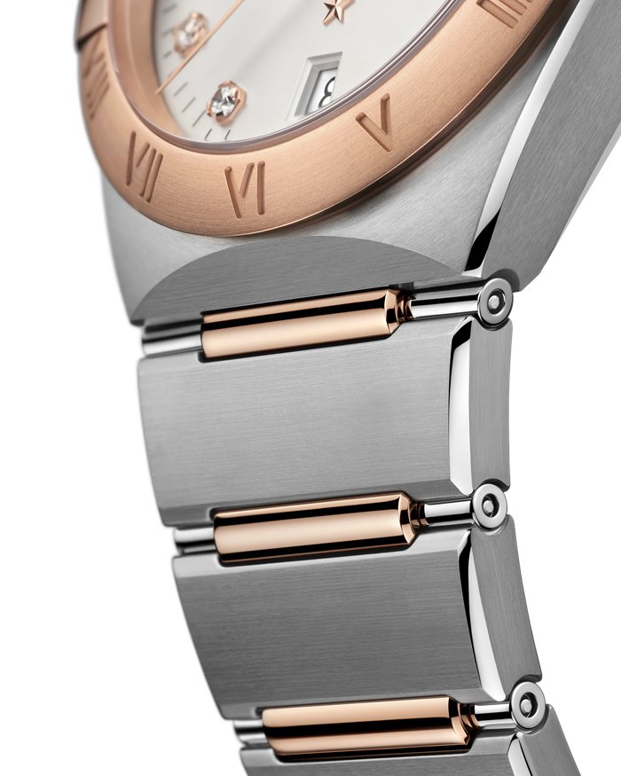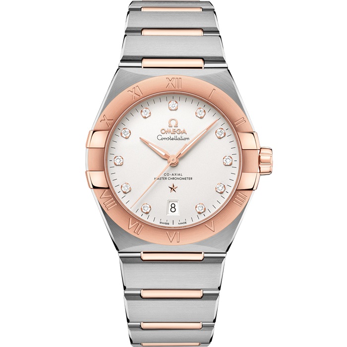 Questo modello da 39 mm in acciaio inossidabile e oro Sedna™ 18K presenta una lunetta con numeri romani incisi, un quadrante bianco argentato-opalino con indici in diamanti e un datario a finestrella a ore 6. Le lancette, il logo OMEGA, la stella Constellation e i supporti dei diamanti sono tutti in oro Sedna™ 18K.