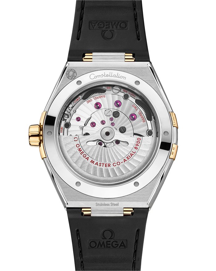 Questo modello da 41 mm in acciaio inossidabile e oro giallo 18K presenta un anello della lunetta in ceramica lucida nera con numeri romani in OMEGA Ceragold™. Il modello presenta inoltre un quadrante verde con effetto sfumato e finitura spazzolata a raggi di sole e un datario a finestrella a ore 6. Sono in oro giallo 18K anche le lancette, il logo OMEGA, la stella Constellation e gli indici.