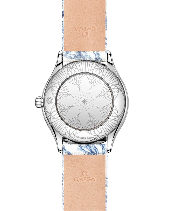Il modello in acciaio inossidabile presenta una cassa da 26 mm con diamanti elegantemente disposti lungo i bordi. Sulla corona, invece, è incastonato un unico diamante circondato da un fiore in ceramica liquida rossa. Il quadrante bombato è realizzato in smalto “Grand Feu” bianco sporco e presenta lancette rodiate diamantate e indici con numeri romani applicati blu.