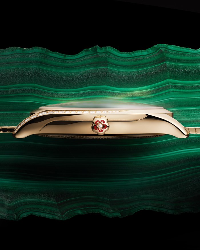 Per questo modello, la sottile cassa da 36 mm è realizzata in oro Moonshine™ 18K e ornata da 38 diamanti taglio brillante disposti elegantemente lungo i bordi ondulati. Il quadrante bombato in malachite vanta numeri romani bombati applicati e lancette diamantate in oro Moonshine™ 18K, mentre la corona presenta un’incisione con il fiore OMEGA, riempita di ceramica liquida rossa e con un diamate incastonato.