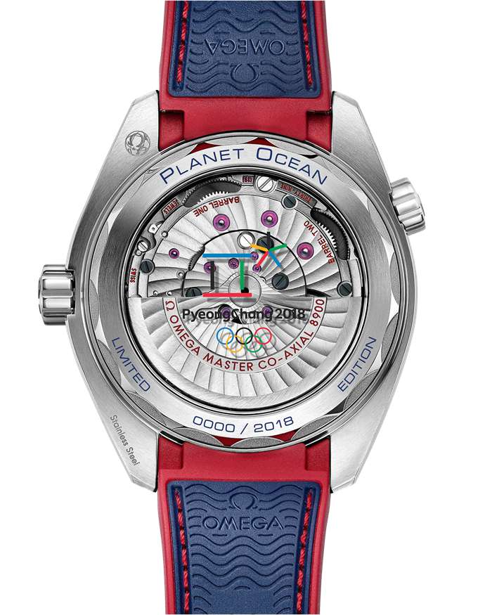 Il fondello reca incise le parole PLANET OCEAN e LIMITED EDITION e il numero di edizione limitata del segnatempo. Le parole “PyeongChang 2018” e il logo delle Olimpiadi sono riportati sull’oblò in vetro zaffiro del fondello.