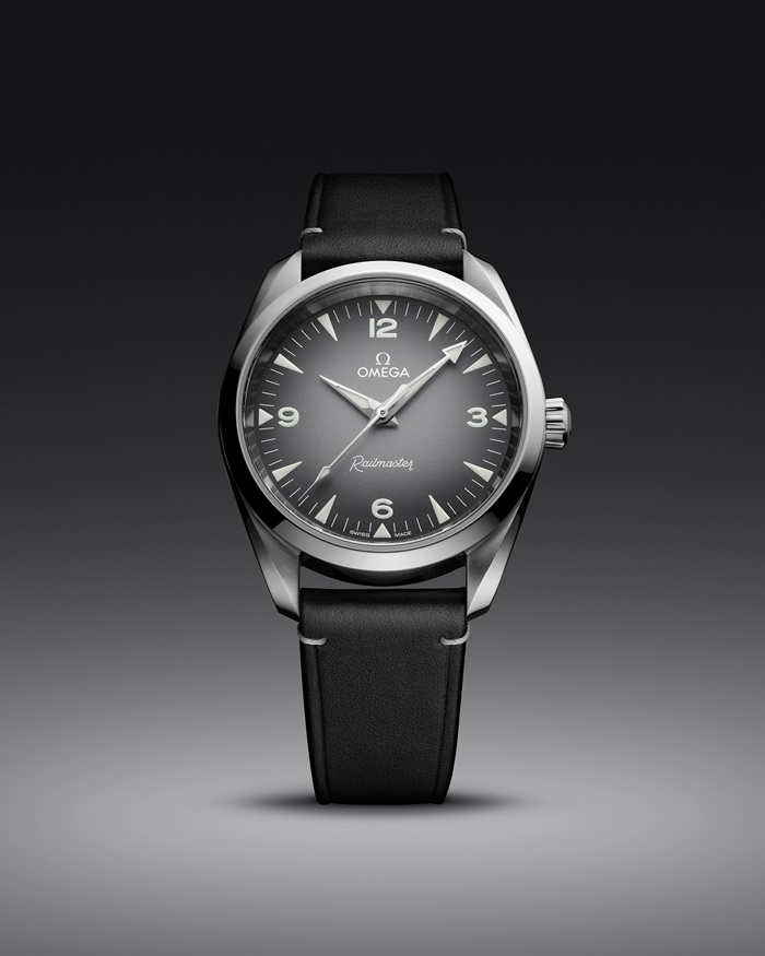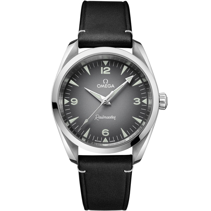 La cassa simmetrica da 38 mm è lucida e spazzolata, e corredata da un cinturino in pelle nera. Nel rispetto dei codici di design del Railmaster originale, il quadrante di facile lettura è color grigio con sfumature nere e presenta numeri grandi e indici delle ore in Super-LumiNova bianca.