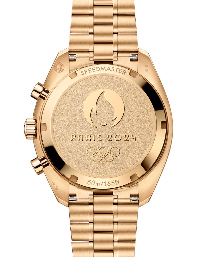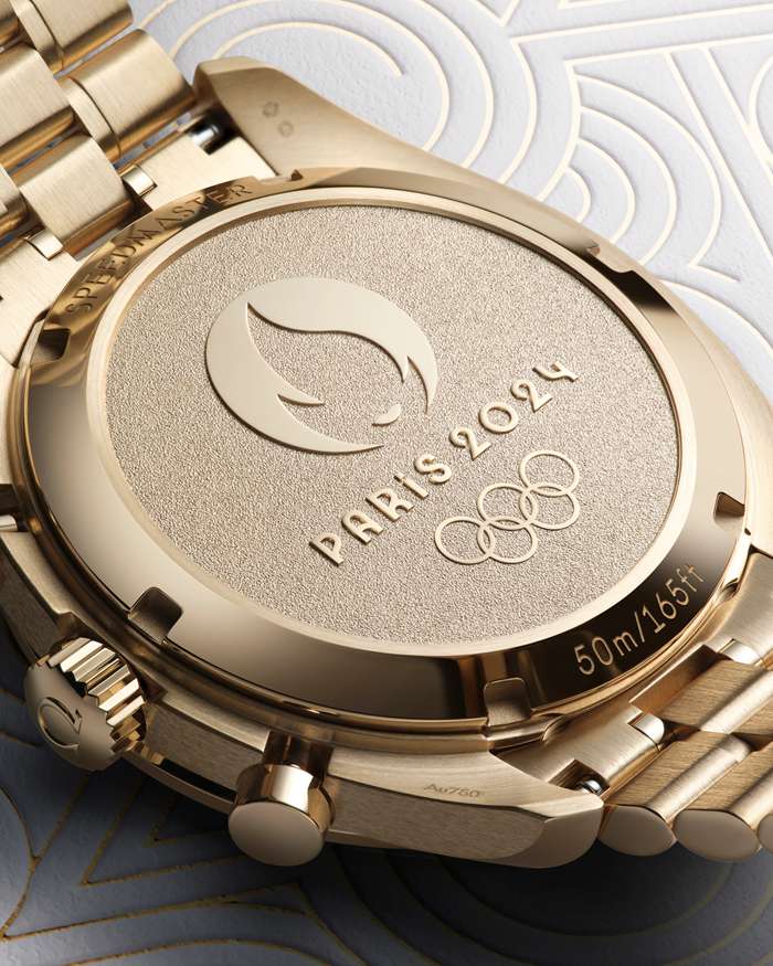 Sul retro, il fondello commemorativo in oro Moonshine™ 18K rivela un medaglione stampato con base smerigliata e logo di Parigi 2024 lucidato a specchio, con la scritta “Paris 2024” e i Cerchi Olimpici.