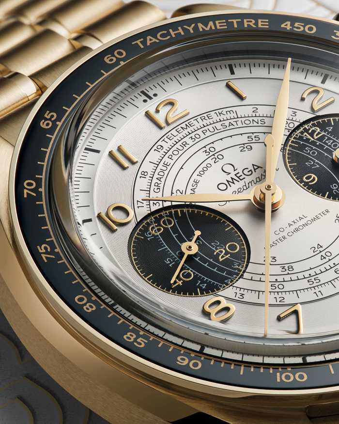 Questo modello da 43 mm è un omaggio alle Olimpiadi di Parigi 2024 e sfoggia i tre colori principali dell’evento: oro, nero e bianco. L’orologio è realizzato in oro Moonshine™18K e presenta un quadrante bianco argentato opalino con contatori bruniti. Tra le caratteristiche aggiuntive si annoverano l’anello della lunetta in ceramica nera con scala tachimetrica in Ceragold™ OMEGA, i numeri arabi in oro Moonshine™ 18K e le lancette a foglia e dei contatori con trattamento in PVD oro Moonshine™.