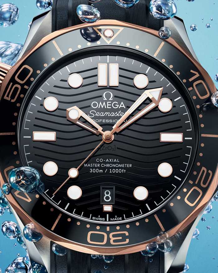 Questo modello da 42 mm è realizzato in acciaio inossidabile e oro Sedna™ 18K e presenta una lunetta in ceramica nera con scala graduata in Ceragold™. Il quadrante in ceramica nera lucida sfoggia un motivo a onde inciso al laser e un datario a finestrella a ore 6.