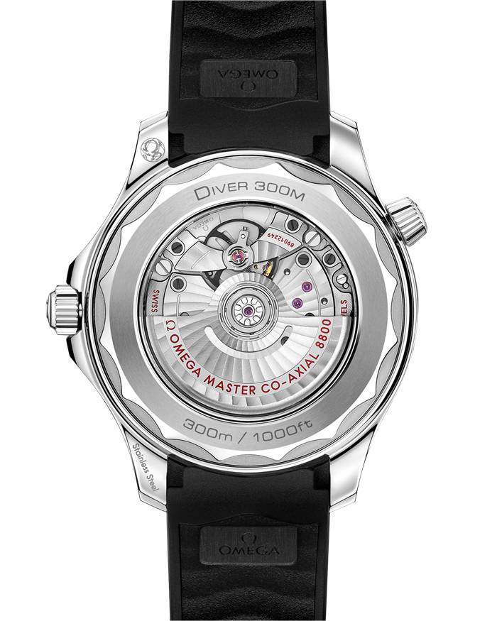 Questo modello da 42 mm è realizzato in acciaio inossidabile e presenta una lunetta in ceramica nera con scala graduata in smalto bianco. Il quadrante in ceramica bianca lucida sfoggia un motivo a onde inciso al laser e la scritta Seamaster in rosso.