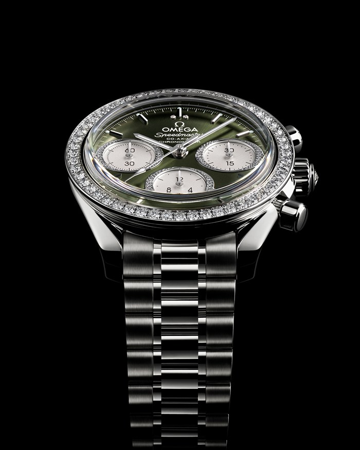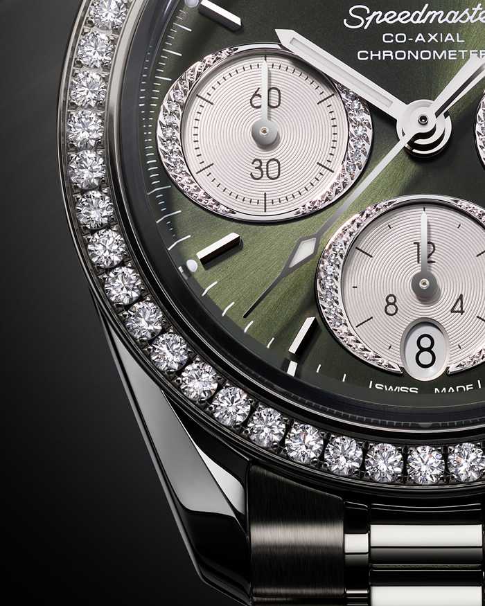 Il quadrante in PVD verde comprende contatori ovali orizzontali con rivestimento argentato e un datario a finestrella ovale verticale a ore 6. Le lancette di ore e minuti, diamantate e rodiate lucide, sono riempite di Super-LumiNova bianca che emette una luminescenza verde.