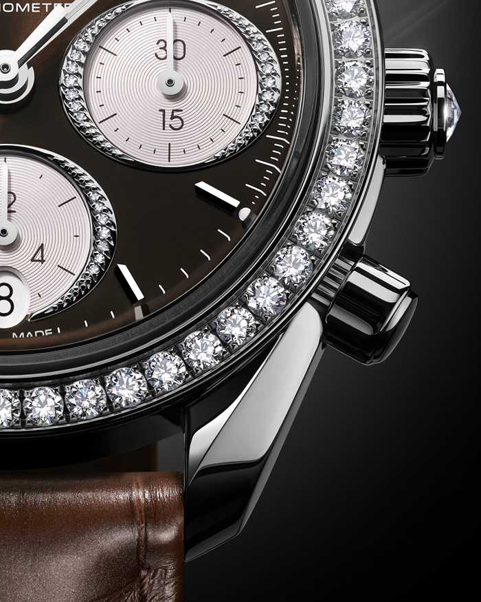 Il quadrante in PVD marrone comprende contatori ovali orizzontali con rivestimento argentato e un datario a finestrella ovale verticale a ore 6. Le lancette di ore e minuti, diamantate e rodiate lucide, sono riempite di Super-LumiNova bianca che emette una luminescenza verde.