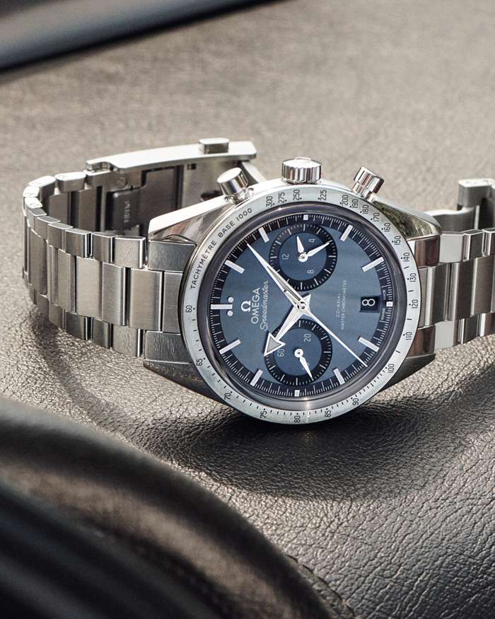 La lunetta spazzolata presenta una scala tachimetrica brunita, mentre il fondello piatto in vetro zaffiro con trattamento interno antiriflesso è caratterizzato dall’incisione “Speedmaster ‘57”.