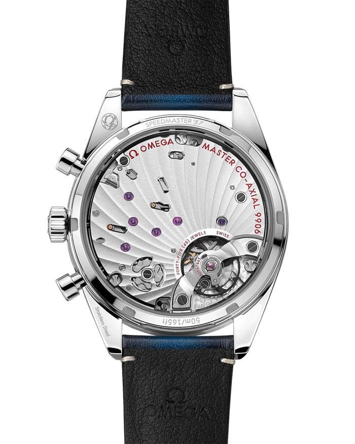 La lunetta spazzolata presenta una scala tachimetrica brunita, mentre il fondello piatto in vetro zaffiro con trattamento interno antiriflesso è caratterizzato dall’incisione “Speedmaster ‘57”.