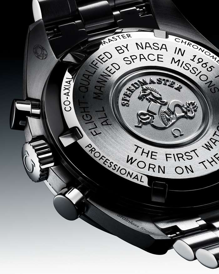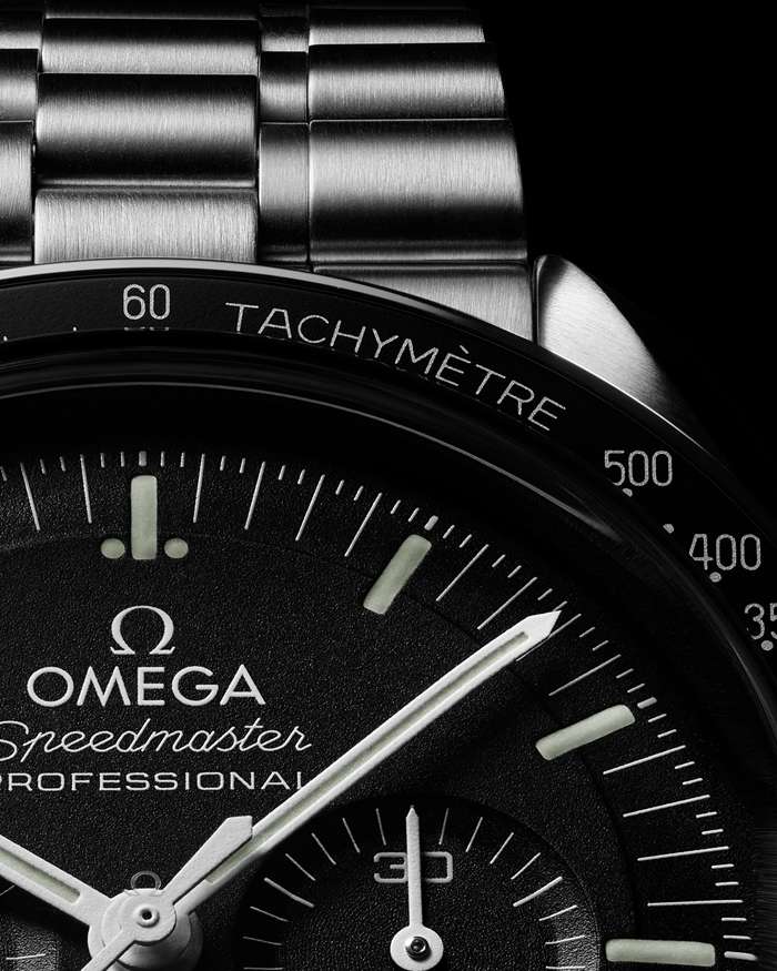Corredato di un bracciale spazzolato a 5 maglie incurvate per fila, questo Moonwatch da 42 mm in acciaio inossidabile presenta un vetro esalite sul quadrante e un medaglione con ippocampo goffrato sul fondello. Ispirato allo Speedmaster di 4a generazione indossato sulla luna, il modello si distingue inoltre per la cassa asimmetrica, il quadrante “step” nero e il celebre indice “Dot over 90” sull’anello della lunetta in alluminio anodizzato.