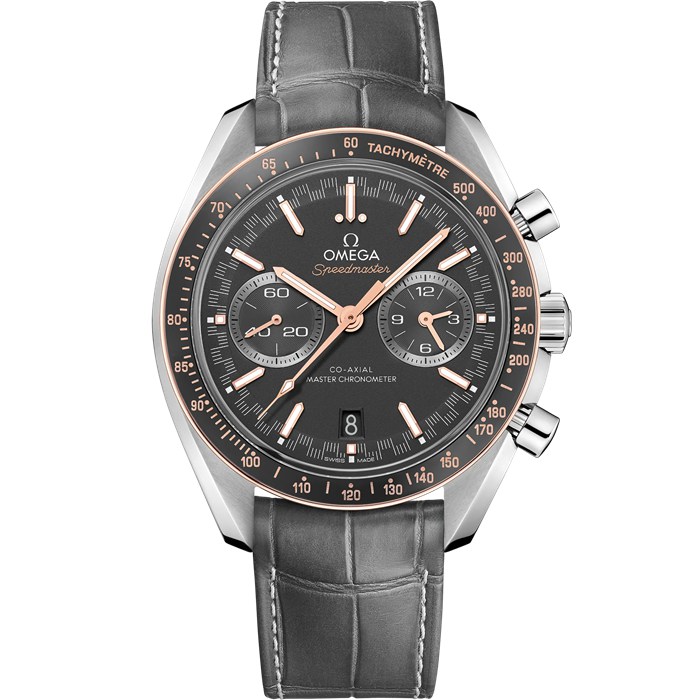 Dotato di un cinturino in pelle grigia, questo Speedmaster Racing Master Chronometer presenta una cassa da 44,25 mm in acciaio inossidabile con lunetta in oro Sedna™ 18K che include un anello in nitruro di silicio con la famosa scala tachimetrica in OMEGA Ceragold™.