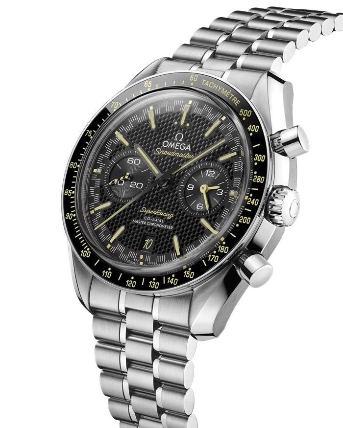 Gli indici smussati a freccia diamantati sono dotati di un rivestimento nero e riempiti di Super-LumiNova con luminescenza gialla. Un codice cromatico ripreso anche dalle scritte SPEEDMASTER e SUPER RACING presenti sul quadrante.