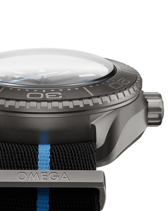 Questo modello da 45,5 mm in titanio grado 5 sabbiato vanta un anello della lunetta in ceramica nera spazzolata con scala graduata in Liquidmetal™. Visibile attraverso il fondello in vetro zaffiro bombato sporgente, il quadrante ceramizzato in titanio grado 5 presenta una lancetta dei secondi effetto sfumato che vira dal bianco al ciano, numeri arabi ciano e indici delle ore e lancette delle ore e dei minuti in oro bianco 18K rivestiti in Super-LumiNova bianca.